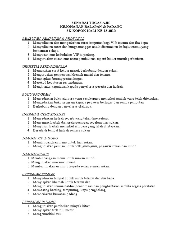 PANDUAN SENARAI TUGAS JAWATANKUASA KERJA PERTANDINGAN PERINGKAT DAERAH DAN NEGERI1. Memastikan kebersihan dan keyakinan. Merancang dan mengadakan jamuan mengikut persetujuan AJK Pengelola menetapakn tarikh.