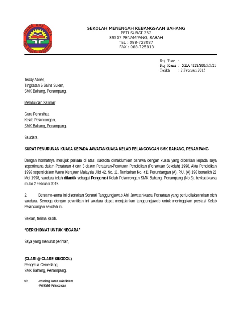 Sebagai satu kawalan dalaman PengetuaGuru Besar hendaklah mengeluarkan satu surat penurunan kuasa secara rasmi bagi pegawai yang mengendalikan PWR seperti di Lampiran PWR 4 AP 69Merekodkan Penerimaan Sebaik sahaja cek untuk panjar wang runcit dikeluarkan daripada Kumpulan Wang berkenaan PendahuluanRekupmen butir-butir berikut hendaklah. 2007 LAMPIRAN 9J - Catatan Mesyuarat Tapak. Contoh Surat Penurunan Kuasa Kewangan Sekolah picture posted and uploaded by Gambarinus that preserved in our collection.